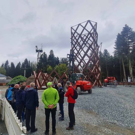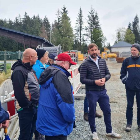 Der Höhepunkt des Ausflugs war die Vorstellung des neuen, im Bau befindlichen, Aussichtsturms am Knock. Bürgermeister Christian Ruppert persönlich informierte, zusammen mit dem Verwaltungsleiter Frank Wunner, die winFORS-Gruppe zum Turm und berichtete stolz über die Bedeutung des Baus für den Tourismus und die Bewohner von Presseck. Der rund 42 Meter hohe Turm bietet einen beeindruckenden Panoramablick über den Frankenwald und wurde als Teil des Leader-Programms errichtet, welches die regionale Entwicklung in ländlichen Gebieten fördert. Neben dem Turm stellte der Bürgermeister weitere Neuerungen vor, die im Rahmen dieses Programms umgesetzt werden, darunter ein neues Infozentrum, das den winFORS Mitgliedern sogleich als Brotzeitstube diente, Erholungsflächen, ein Niederseilgarten, ein Wasserspielplatz und Informationspunkte, die Presseck noch attraktiver für Besucher machen sollen.