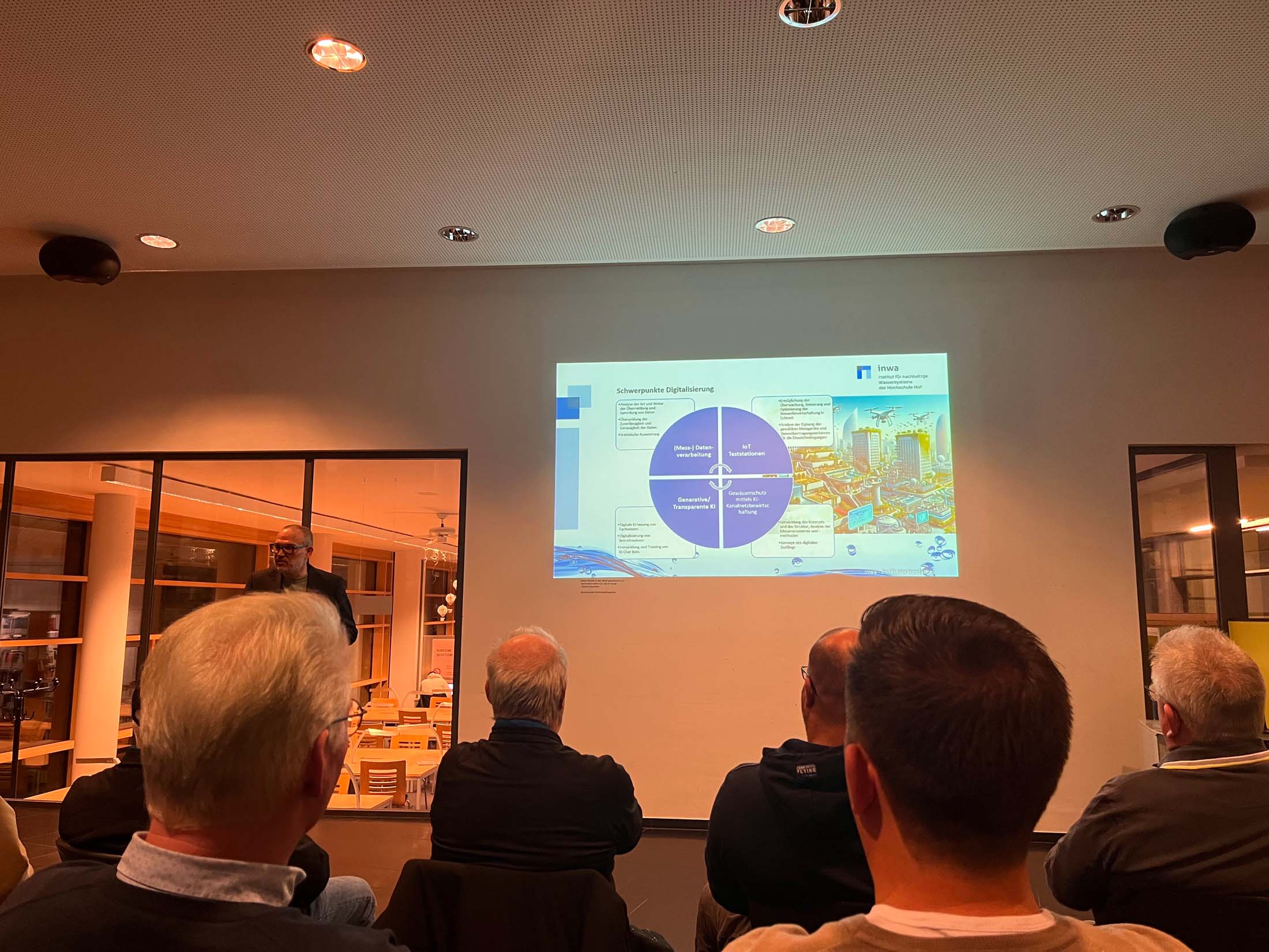 Am Dienstag, den 11. November, trafen sich Mitglieder und Gäste von winFORS e.V. an der Hochschule für angewandte Wissenschaften Hof, um einen tiefen Einblick in die wissenschaftliche Arbeit des Instituts für nachhaltige Wassersysteme (inwa) zu erhalten. Gastgeber war Prof. Günter Müller-Czygan, Institutsleiter und Leiter der Forschungsgruppe Wasserinfrastruktur und Digitalisierung.